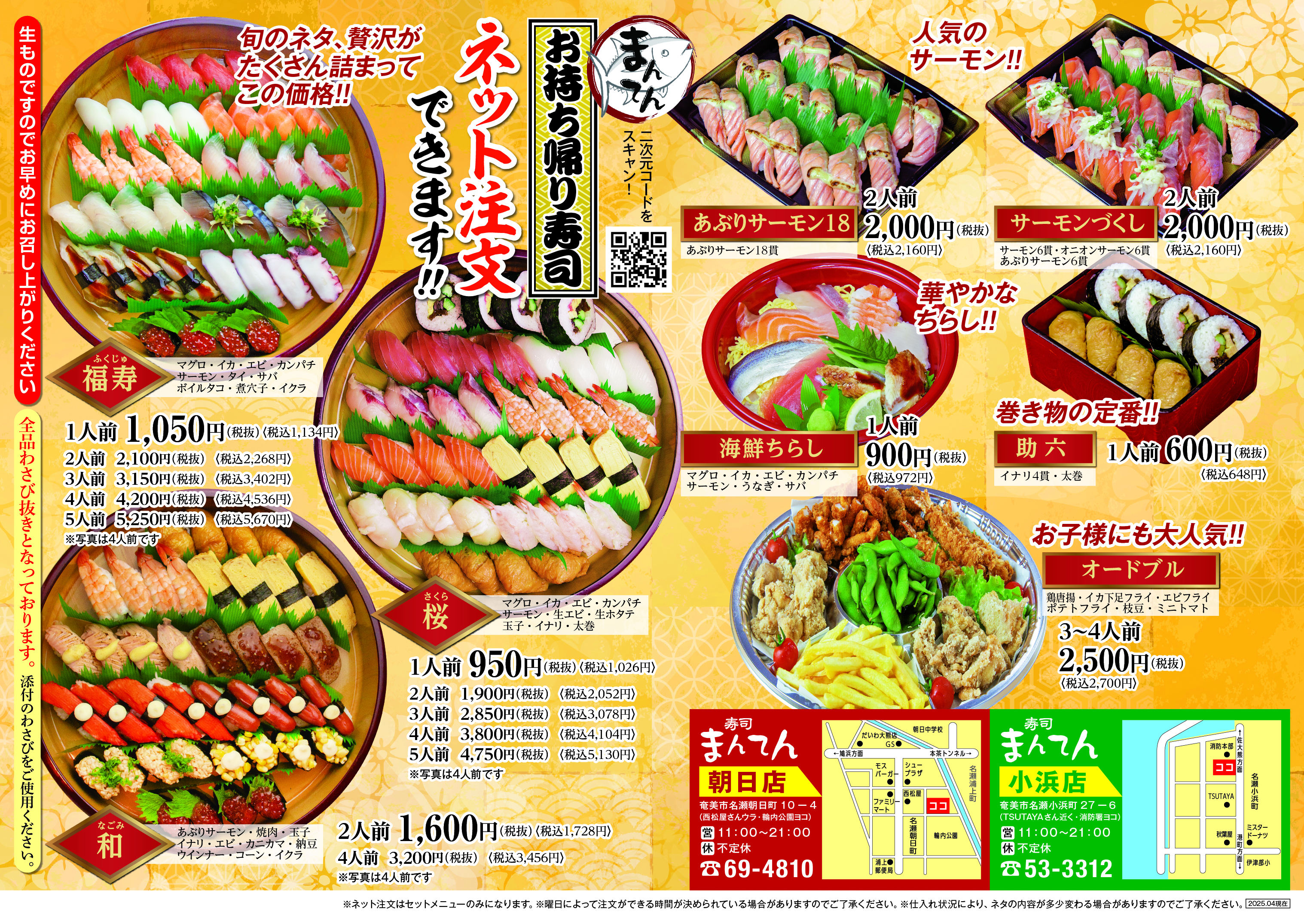 INFORMATION HOME > INFORMATION > お持ち帰りのメニューが新しくなりました! お持ち帰りのメニューが新しくなりました! 2025/03/26 テイクアウトの注文はスマホからできます。 https://amamieats.com/ ↓↓↓店頭でのお持ち帰りはネタをお選びいただけます↓↓↓ シェア Tweet ページ一覧 HOME 会社案内 六興産業のこだわり すし まんてん小浜店 すし まんてん朝日店 求人 お問い合わせ プライバシーポリシー サイトマップ Information お持ち帰りのメニューが新しくなりました! お店の順番待ちがHPから出来るようになりました! カレンダー